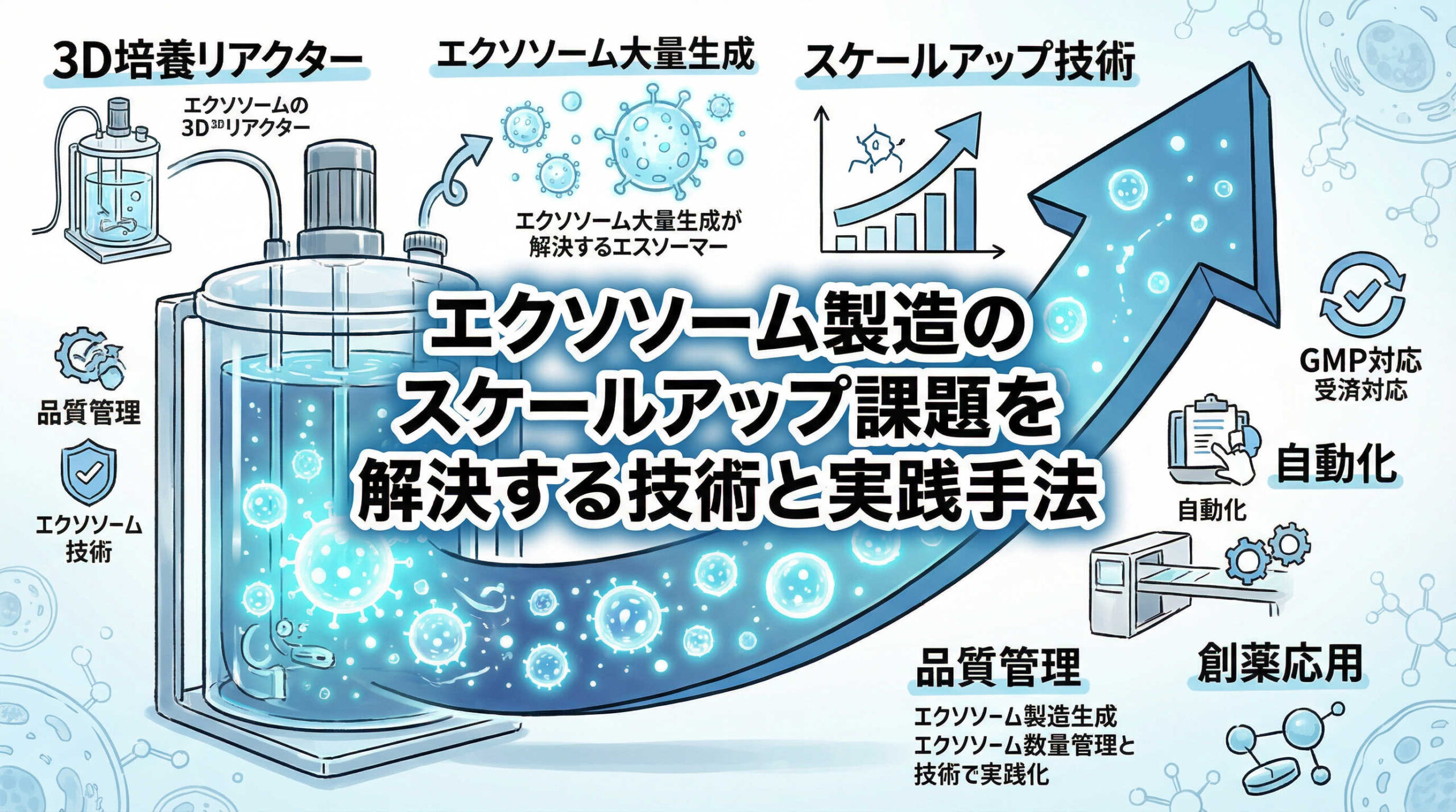 再生医療や創薬の分野において、エクソソーム(細胞外小胞)の治療応用への期待は日増しに高まっています。しかし、研究室レベルでの成果を実用化や商用生産へとつなげる段階で、多くの開発担当者が直面するのが「エクソソーム製造のスケールアップ課題」という大きな壁です。小規模な培養フラスコではうまくいっていた手法も、大量生産となると品質の維持やコスト面で予期せぬ問題が発生することが少なくありません。